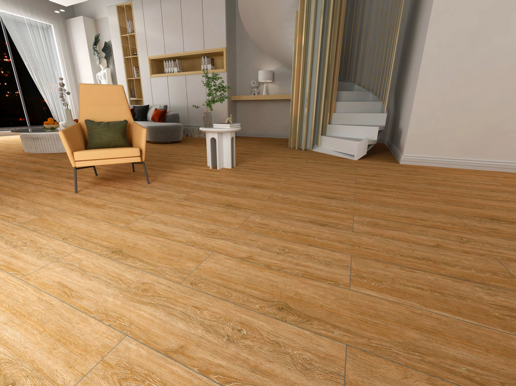 La Cerámica Tipo Madera Nogal Miel Cálido evoca la riqueza y calidez de las maderas tropicales en su tono más natural y auténtico. Su superficie presenta vetas generosas y nudos expresivos en tonos miel, caramelo y ocre que reproducen con gran fidelidad la textura viva de la madera, transmitiendo una energía cálida y acogedora en cada pieza.