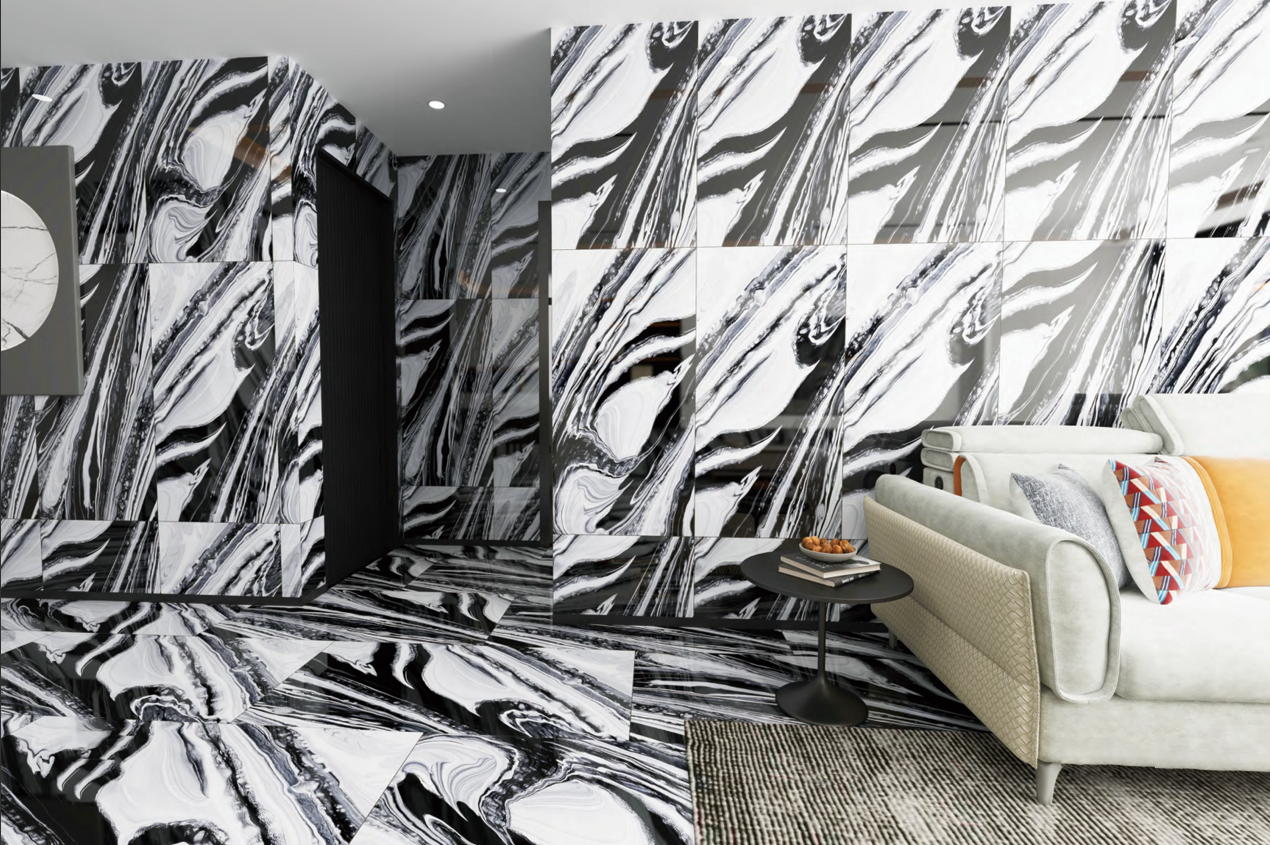 El Porcelanato Negro y Blanco Tipo Mármol Artístico destaca por su diseño impactante y sofisticado, inspirado en los contrastes naturales de las piedras más exclusivas. Su superficie combina tonos negros profundos con vetas blancas fluidas que recorren la baldosa creando un efecto visual dinámico, lleno de movimiento y elegancia.